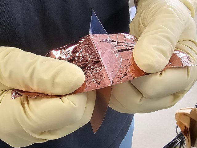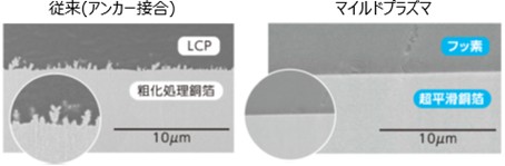 高周波基板やアンテナには、銅箔とPTFE(テフロン:誘電特性に優れる)を貼り合わせた部材が多く使われるが、このような製品の製造に同社のマイルドプラズマが活躍している。従来の接着剤を用いた接合では下処理としてプラズマ処理や薬品によるアンカー処理(表面に凹凸を形成する処理)が必要となるが、この処理過程で生じる凹凸が電気抵抗を増加させ製品の特性に影響を与えることがあった。マイルドプラズマによる直接接合で製造することでこのような下処理が不要となり、電気的特性を損なわない製品づくりが可能となった。強度も十分で、10N/㎝以上を確保しているという。