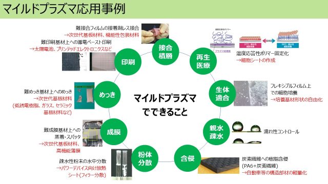 医療やバイオ分野での活用事例も多い。輸液や輸血に用いられる樹脂製パッグは安全性の観点から接着剤レス構造が望ましいが、マイルドプラズマを用いることでフィルム同士を直接接合して製造できる。またバイオ分野では、細胞培養に用いるシャーレへプラズマ処理を施すことで、細胞増殖に適した濡れ性としたり、培養した細胞を剥離回収しやすくしたりした事例もある。