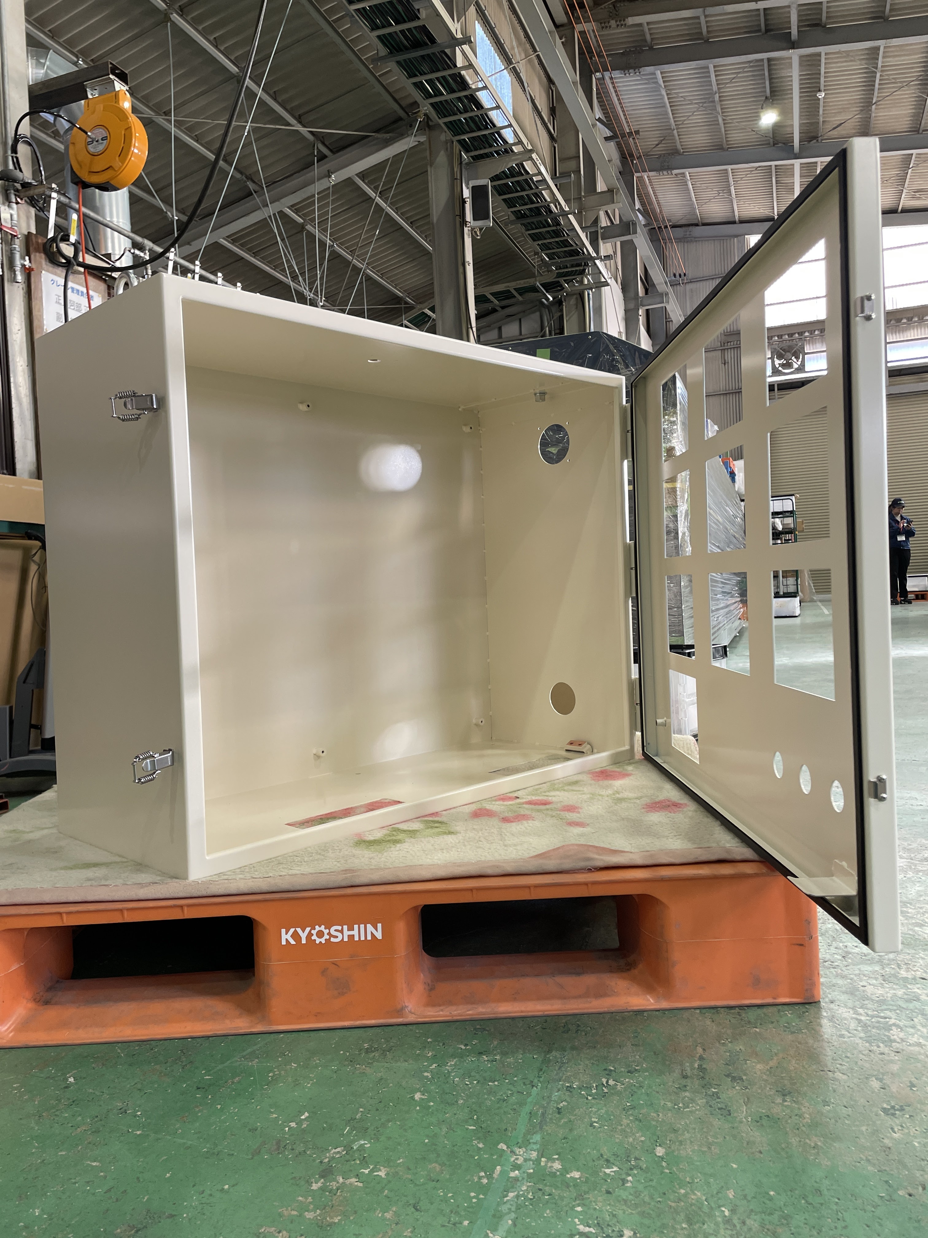 株式会社共進は「装置まるごと製作所」をうたい文句にしている。板金部品製造の会社でありながら、「筐体のみ」や「半完成品」ではなく、機械組立を行い完成品状態で納品できることが強みだ。同社が主に扱うのは、半導体や食品関連などの産業用装置。もともと機械組立がメインで始まり、後から板金部品製造や塗装の内製を始めたという経緯があった。設計部門は持たないが、客先から支給される数十~百枚という大量の図面をもとに、短納期で仕上げられるのは、長く機械組立を行ってきたからこそ持つノウハウなのだ。客先は図面を支給するだけで、部品管理の煩わしさから解放され、管理費の削減にも貢献するというわけだ。