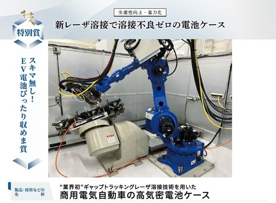 カーボンニュートラルの流れの中で、同社は自家用車だけでなく、8t以下の商用車に着目した。配送業に用いられるこれらの車両は、排気ガス発生の大きな要因となっているためだ。しかし商用車は自家用車に比べ生産台数が少ないことから、板金加工となることが多い。だが、板金では精度の問題から品質の安定性に不安がある。そこで同社が開発したのがギャップトラッキングレーザ溶接工法だ。レーザ加工の課題として、0.2㎜以上のすき間では接合ができないが、板金ではこの精度を達成できない。そこで、自社でレーザ軌跡コントロールシステムを開発。溶接を行いながら計測して溶接線の位置ずれ・すきまに合わせてレーザ照射することで、板金部品の極めて高精度・高気密性なレーザ溶接を可能としたのだ。このギャップトラッキングレーザ溶接工法は、「関西ものづくり新撰2025特別賞」を受賞。自動車用電池のみならず、幅広い分野での活用が期待できる新技術なのだ。