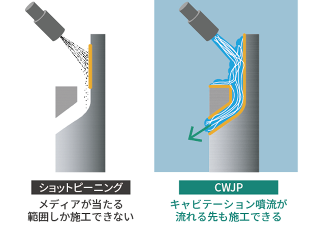 キャビテーションとは温度上昇による液相が気相に相変化する沸騰現象とは異なり、流体の流れの中で圧力差によって減圧され、液相が気相に相変化することで、短時間で発生と崩壊が起きる物理現象である。船舶のスクリュー等には日常的に発生している現象であり、長時間のキャビテーションに晒されると「壊食」と呼ばれる破壊現象を引き起こし、部品寿命を著しく低下させるため、キャビテーション現象は一般的に好まれるものではない。一方で、キャビテーションが発生させるエネルギーは大きく、キャビテーションが崩壊する際にGPa(ギガパスカル)クラスの衝撃力を生ずる。このキャビテーションをコントロールすることで有効に活用することが出来る。株式会社スギノマシンが提案するのは、従来工法のピーニング工法とは異なるキャビテーションウォータージェットピーニング(CWJP)だ。