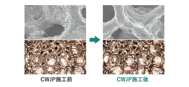 CWJPはショットピーニングの代替としてではなく、既存工法では適用できなかった新しい領域の開拓を目指している。その1例が金属3Dプリンタだ。金属3Dプリンタで造形された部品の表面には、未融解粉が付着しており、洗浄を必要とする。インプラントや人工骨で用いられる生体適合表面など、内部に微細な気孔を持つ多孔質構造といった複雑な形状は従来の超音波洗浄では難しい場合がある。CWJPならば洗浄だけでなく、さらに圧縮応力も付与して強度を上げることが可能というわけだ。繊細な表面でも、CWJPならば損傷させずに未融解粉だけを取り除くことができる。