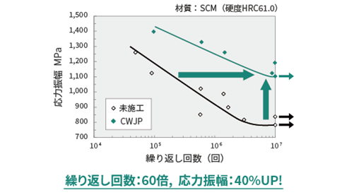また、CWJPは金型と非常に親和性の高い技術だ。CWJPを施すことで金型寿命が1.5倍~3倍に向上したという実績がある。鋼材の種類や用途にもよるが、特に冷間鍛造金型との相性が高いという。またピーニング工法では加工が難しい従来金型の冷却回路の長寿命化や金属3Dプリンタで造形された金型の流路などの深穴や細穴、複雑形状にも適応できる可能性がある。スギノマシンはさらに精密金型にも挑戦していきたいという。CWJPならばシャープエッジをダレさせることなく、寸法精度を保持したまま長寿命化を達成できるためだ。ダイス鋼やハイス鋼といった金型によく用いられる金属だけでなく、アルミや銅などの他の鋼材でも同様に圧縮応力を付与することができる。