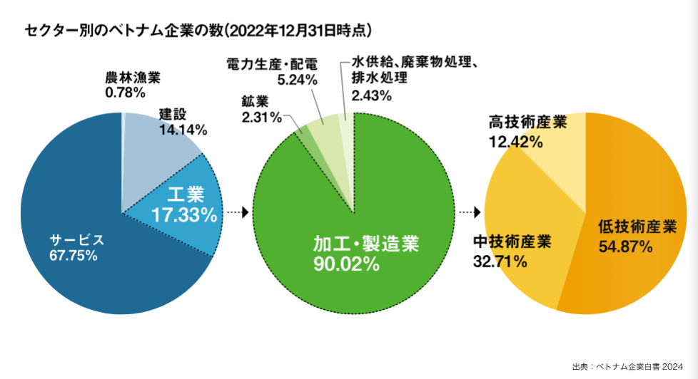 統計総局の公表データによれば、2022年末時点におけるベトナムの工業関連企業数は約12万7,500社に達している。そのうち加工・製造業が約11万4,700社を占め、全体の9割以上を構成する。一方で、ハイテク分野に分類される企業は12%強にとどまり、依然としてローテク企業が過半数を占める産業構造が続いている。