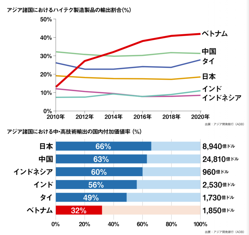 ベトナムのハイテク製品輸出は著しい伸びを示しており、輸出全体に占める比率は2010年の13%から2020年には42%へと拡大した。しかし、国内で創出される付加価値の割合は2020年時点で32%にとどまり、10年間での上昇幅は限定的である。この背景には、設計や中核技術を外国企業に依存し、ベトナムが主に組立と輸出を担う立場にあるという構造的要因が存在する。その結果、利益の多くが国外に流出している点は否めない。