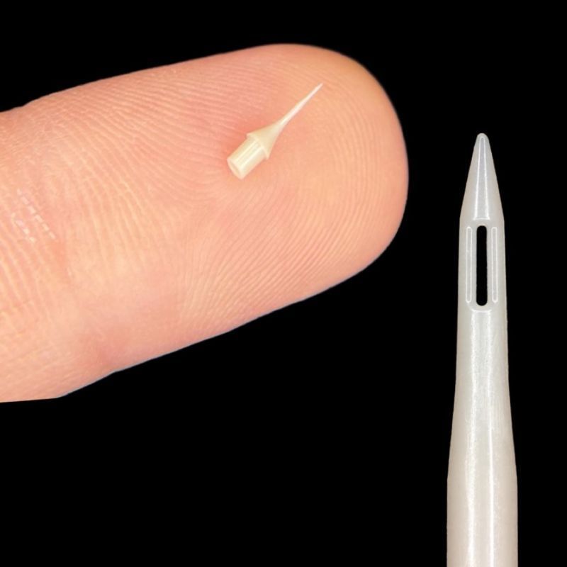 同社の技術力を象徴する取り組みが、PEEK樹脂を用いた樹脂製注射針の開発である。外径0.24mm、内径0.07mmという極細構造を安定的に量産するためには、サブミクロン単位での精度を実現する金型設計技術と高度な成形ノウハウが不可欠である。先端形状に独自の丸みを持たせることで、細胞を切るのではなく押し分ける構造を実現し、痛みの軽減や低侵襲化への可能性を広げている。